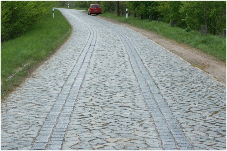 Bild 10: Schlackensteine im Verbund mit Naturstein als Straßenpflaster bei Grimschleben (Sachsen Anhalt, Foto Stedingk)