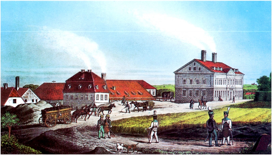 Bild 6: Die Gottesbelohnungshütte bei Hettstedt mit dem 1825 bis 1827 erbauten Amalgamierwerk um 1837 (Zeichnung Giebelhausen, Archiv Mansfeld Museum, Hettstedt)