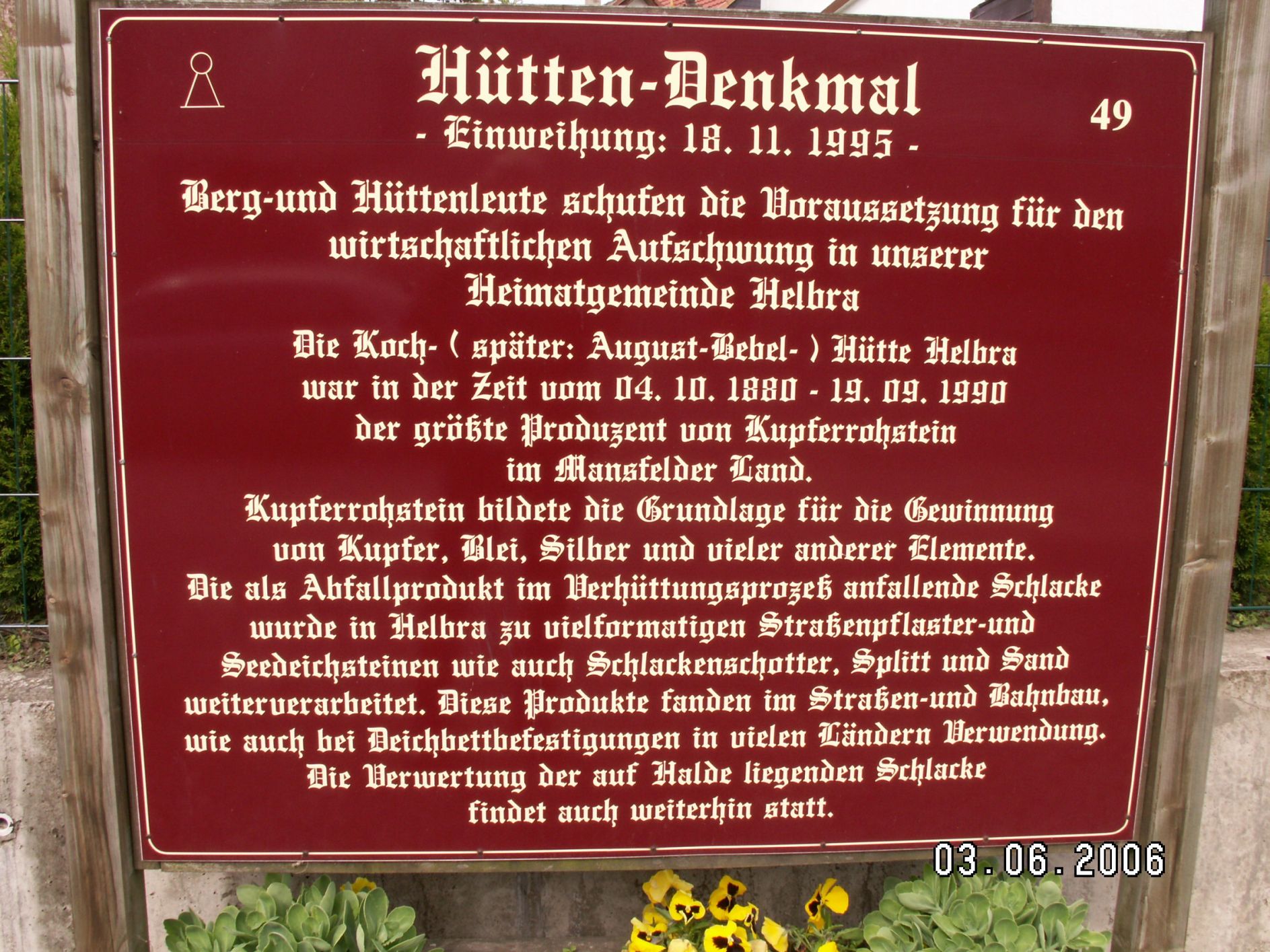Hinweistafel auf das Hüttendenkmal in Helbra vor dem ehemaligen Gemeindeamt (Foto Dammköhler)
