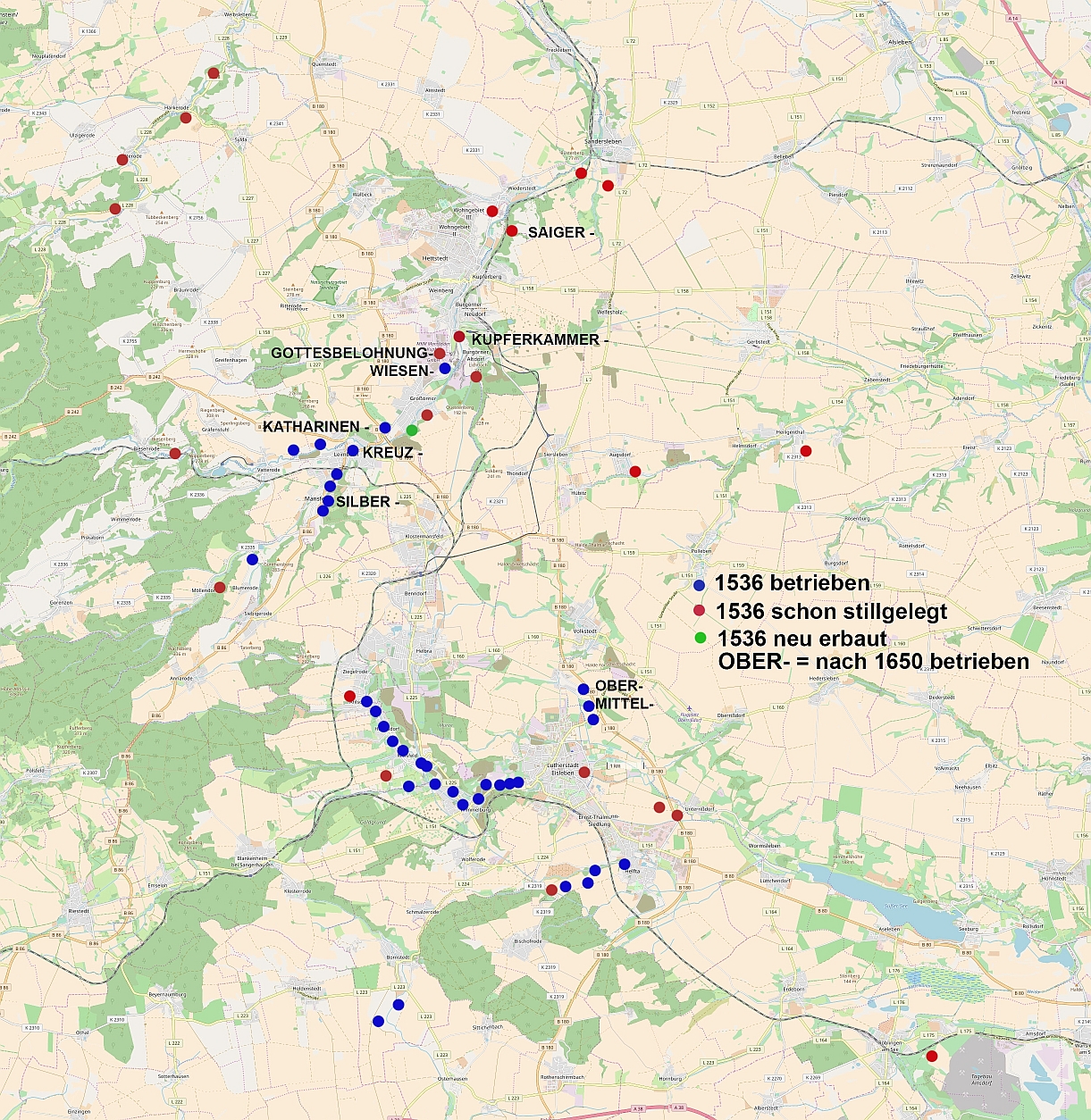 OpenStreetMap mit Standortangaben aus Band I Seite 217 (entzerrt, keine Garantie für korrekte Übernahme)