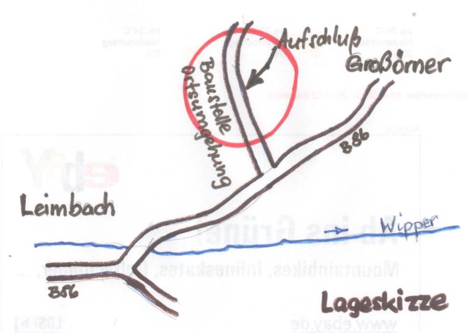 Der Aufschluß befindet sich im Bereich der Straßenbaustelle Ortsumgehung Hettstedt / B 180 unmittelbar nördlich der Einmündung dieser Straße in die B 86 zwischen Mansfeld / Leimbach und Großörner (Skizze von M. Spilker)