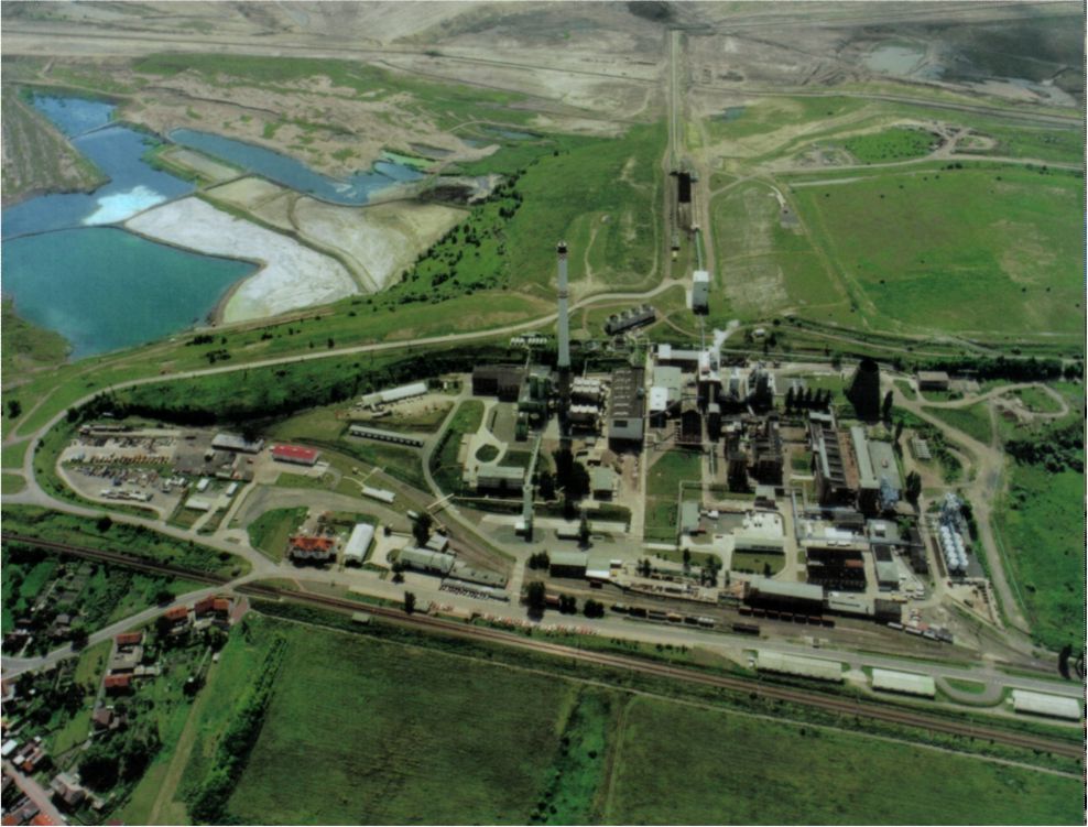 Im Hintergrund breiten sich die Tagebauanlagen der Braunkohlengewinnung aus. Im Vordergrund im Bereich der Anschlussbahn und Landstraße Amsdorf-Unterröblingen befinden sich die Frei-lichtausstellungen der Technikgeschichte des Unternehmens.