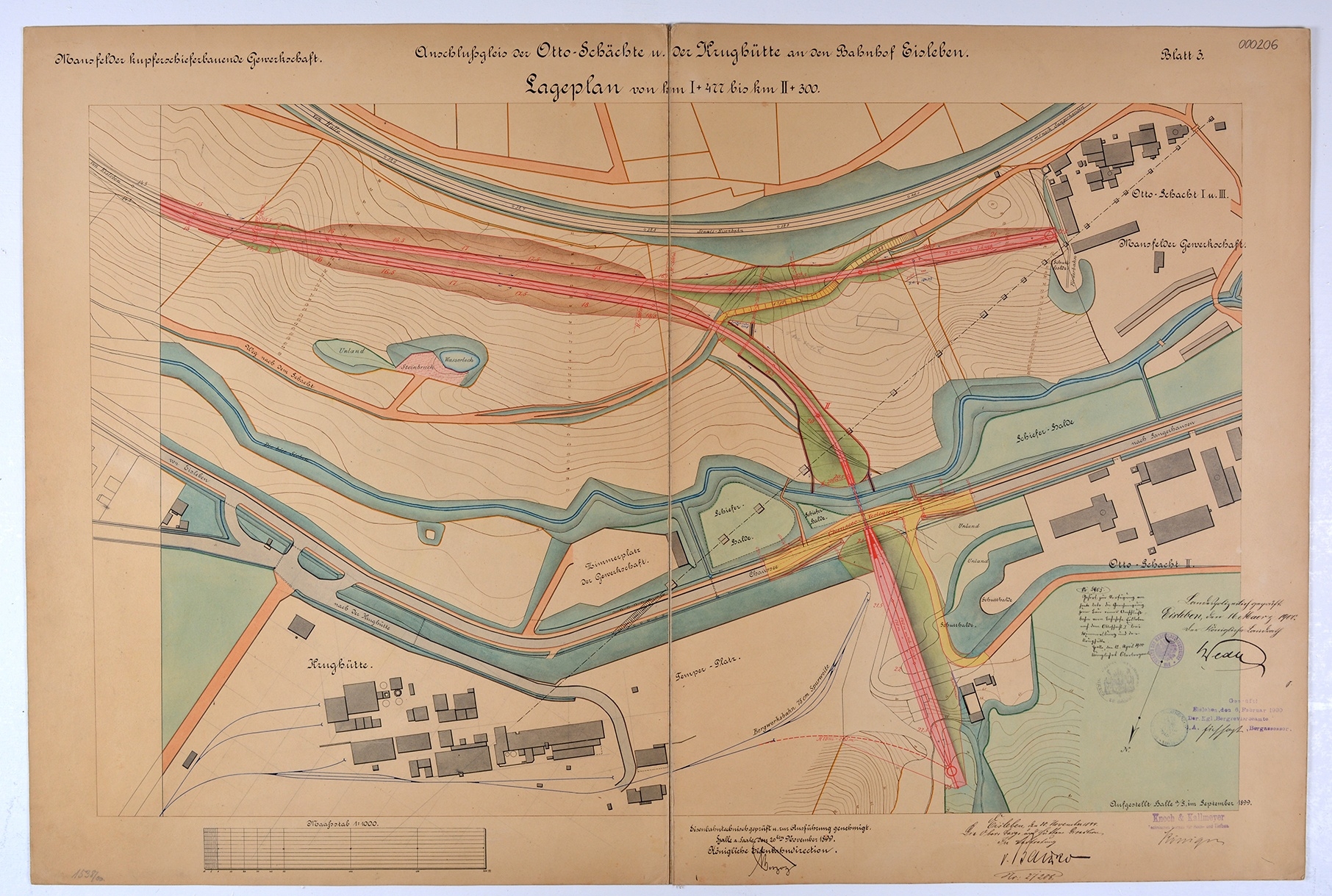 Mansfelder kupferschieferbauende Gewerkschaft. Anschlussgleis der Otto-Schächte u. der Krughütte an den Bahnhof Eisleben. Lageplan von km I + 477 bis km II + 300. Blatt 3 (e?).