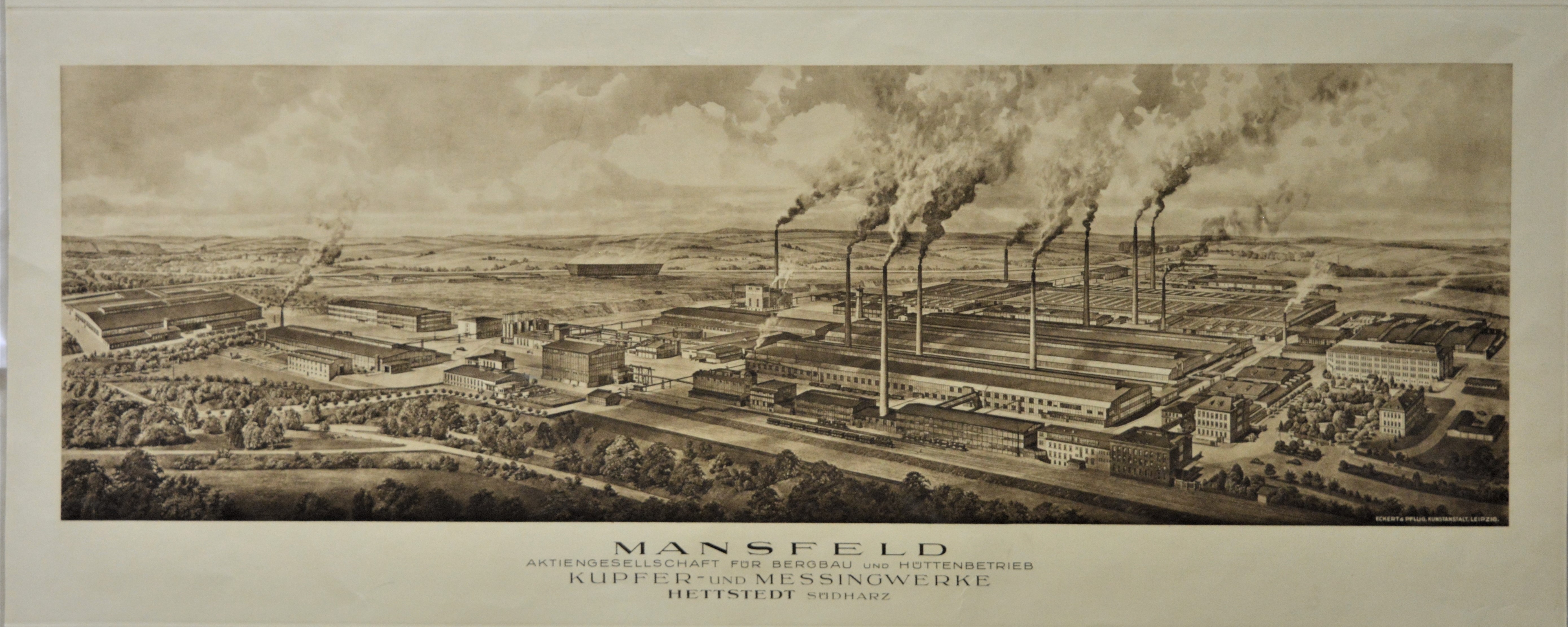Druck einer Gesamtansicht des damaligen Kupfer- und Messingwerkes Hettstedt der Mansfelder Aktiengesellschaft für Bergbau und Hüttenbetrieb ca. um 1920-1930.