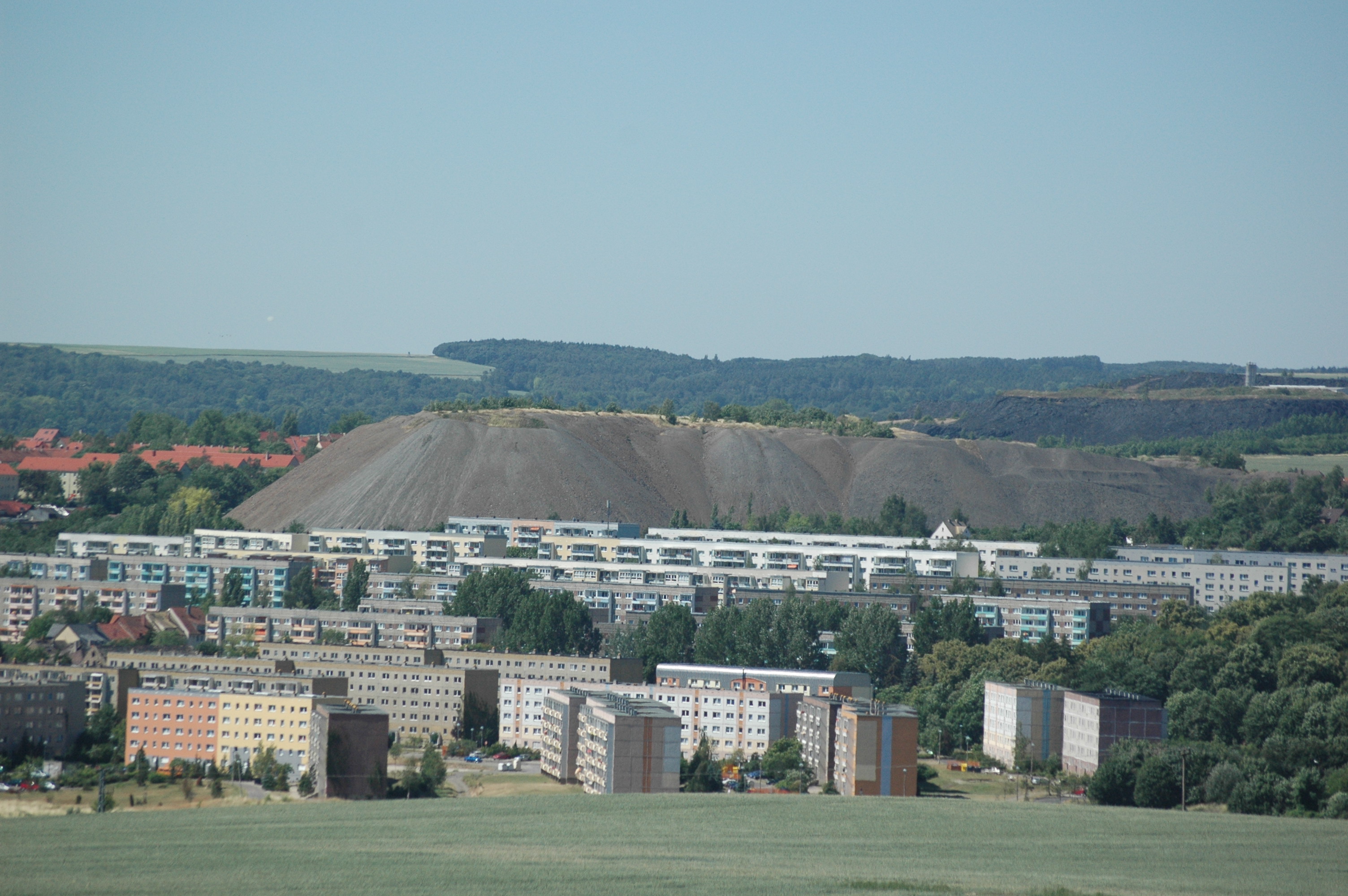 Foto der Südhalde aus Richtung Wolfschacht. Im Vordergrund die Siedlungen Gerbstedter- und Helbraer Straße. Hinter der Halde ist zum Teil die Schlackenhalde der Krughütte zu erkennen.