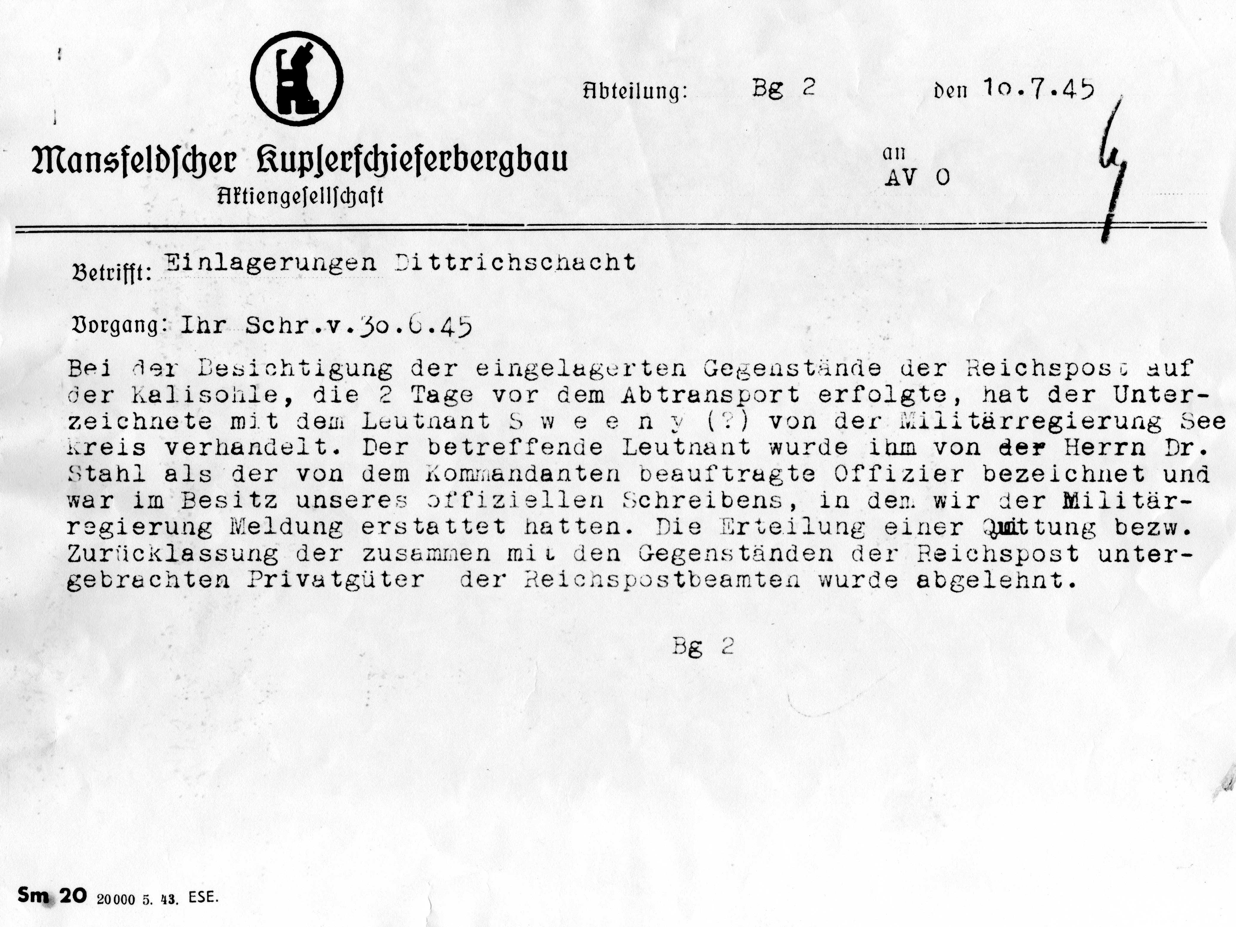 "Die Erteilung einer Quittung bzw. Zurücklassung der zusammen mit den Gegenständen der Reichspost untergebrachten Privatgüter der Reichpostbeamten wurde abgelehnt".