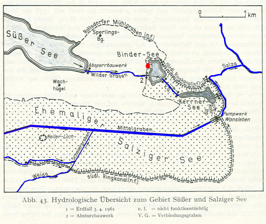 Übersichtskarte des Entwässerungssystems des Seebeckens des ehemaligen Salzigen Sees (Quelle: Werte unserer Heimat 1982, nach AURADA 1969, bearbeitet)