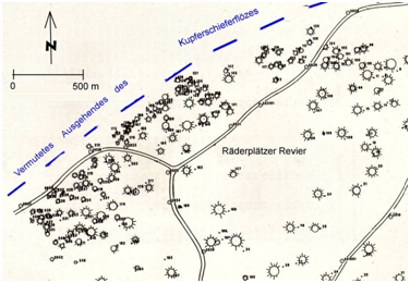 Lageplan von Pingen im Räderplätzer Revier (Quelle: Sommer, F. 1996, Bearbeitet Dr. S. König)